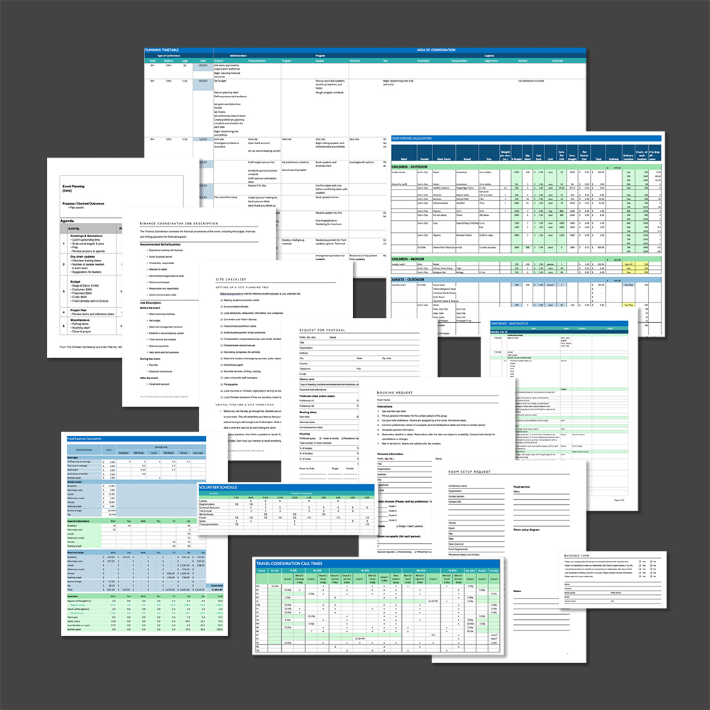 Digital versions of forms found in The Christian Conference and Event Planner. Over 130 Word and Excel editable documents of fill-in forms from the book in addition to additional bonus forms will save you dozens of hours of work. Image shows only a sample of the many documents and spreadsheets included in the bundle.